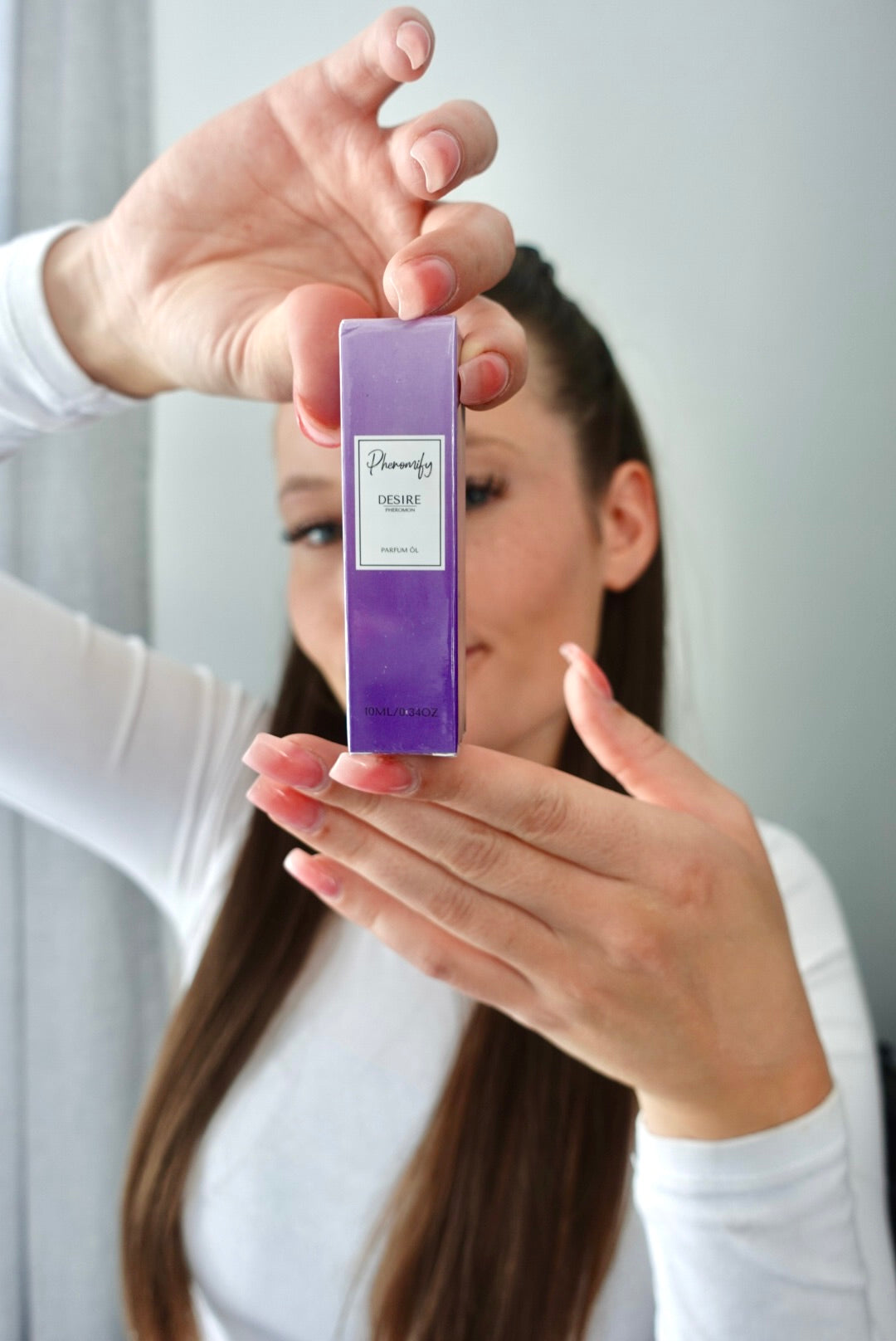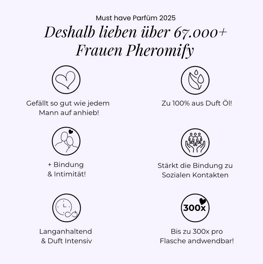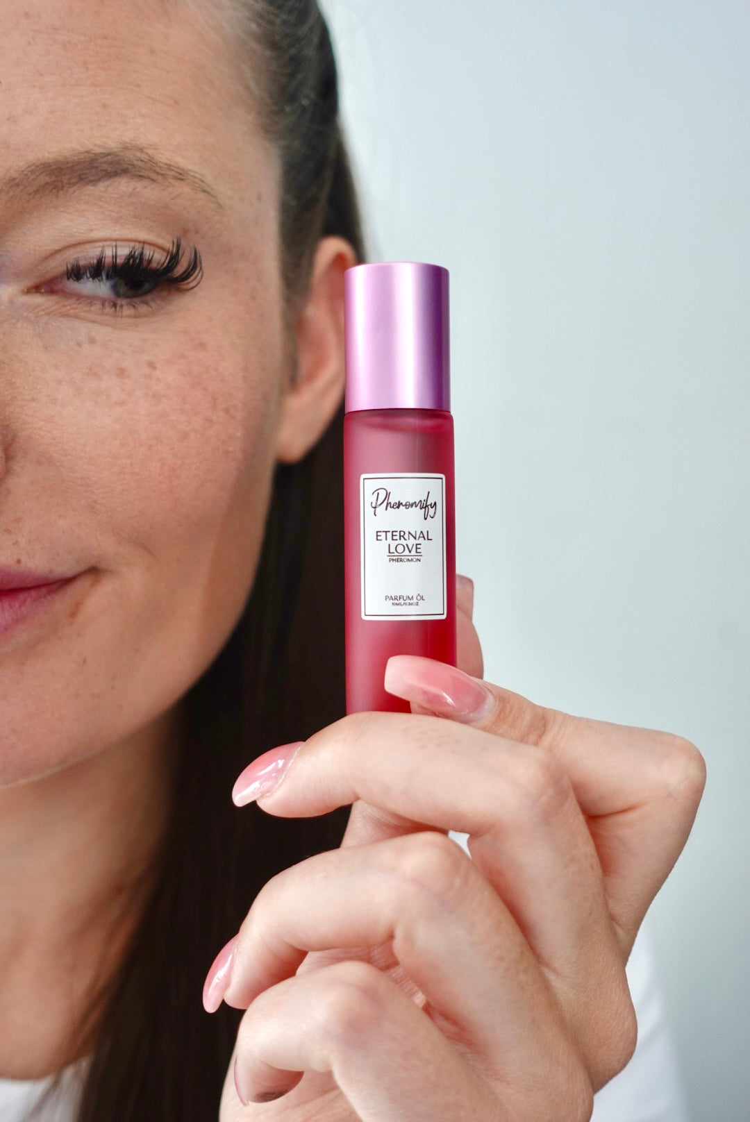 Pheromify besteht ausschließlich aus langanhaltenden Parfüm-Ölen. Diese haften besser auf der Haut, pflegen sie zugleich und verströmen ihren Duft nachweislich länger als herkömmliche Parfums.